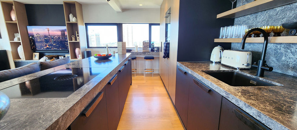 Gourmet marble kitchen with V-ZUG appliances, Liebherr fridge/freeze, BORA Pure induction cooktop, integrated recirculating ventilation, large kitchen island, microwave, dishwasher and barista style coffee machine